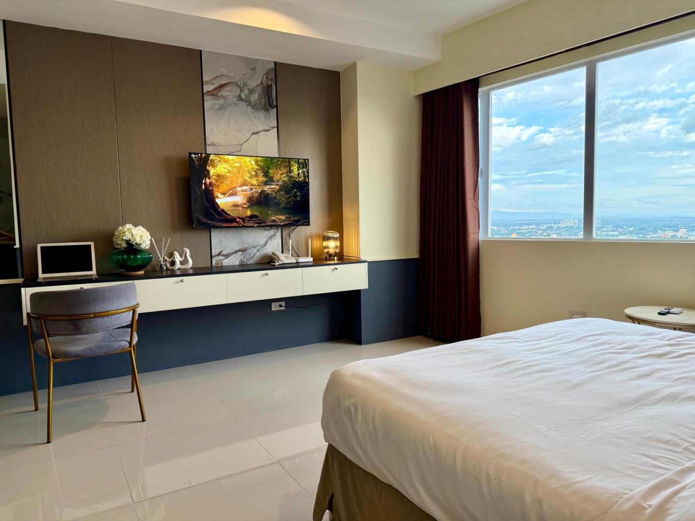 Deluxe Queen Studio. Featuring free toiletries, this studio includes a private bathroom with a shower and a hairdryer. Guests can make meals in the fully equipped kitchen that has a stovetop, a refrigerator and kitchenware. The air-conditioned studio features a flat-screen TV with streaming services, a seating area, a dining area, an electric kettle as well as city views. The unit has 2 beds.